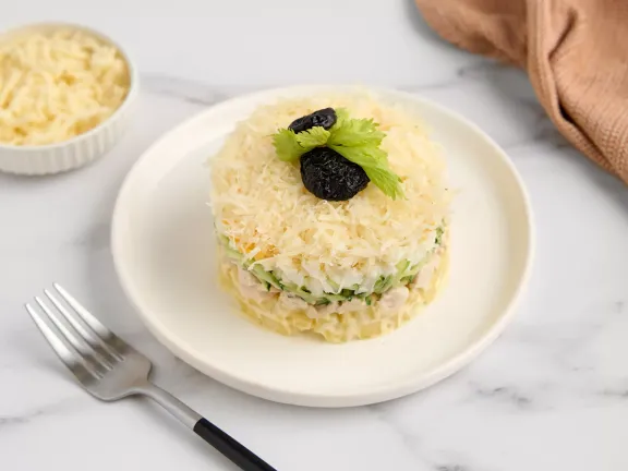 Oddziel białka od żółtek, a następnie zetrzyj je osobno na drobnej tarce. Na tej samej tarce zetrzyj ogórek i twardy ser. Ugotowane piersi kurczaka, ziemniaki i suszone śliwki pokrój w zgrabne kostki o boku 4–5 mm.