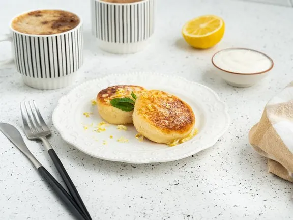 Wyłóż porcję aromatycznych serniczków na talerz. Posyp je świeżo startą skórką cytrynową, udekoruj gałązką mięty i podawaj z przygotowanym sosem śmietanowym. Ciesz się tym wykwintnym śniadaniem lub deserem!