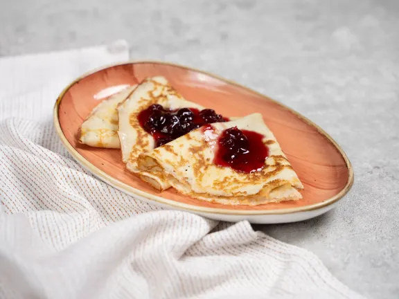 Podawaj gotowe naleśniki, złożone w trójkąt lub kopertę, na talerzu. Polej ulubionym dżemem jagodowym i ciesz się tym ciepłym i aromatycznym przysmakiem!